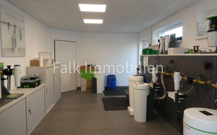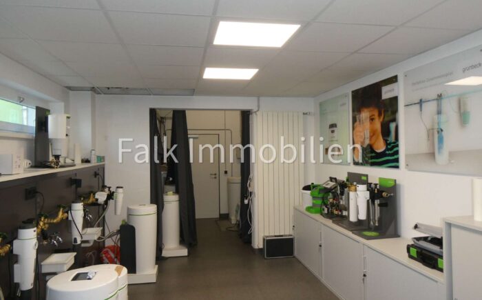 Im Erdgeschoss schaffen eine großzügige Schaufensterfront, eine stilvolle beleuchtete Steinwand und ein Tresen in moderner Milchglasdesign-Optik eine einladende Atmosphäre für Empfang, Ausstellung oder als Bürofläche. Hieran angrenzend finden Sie die Damen und Herren-WCs, die Küche mit Einbauküche, einen Personalraum, den flexibel nutzbaren Besprechungs- oder Lagerraum und den Heizraum mit angeschlossenem Nassraum – welcher ebenfalls als Lagerfläche geeignet ist.
