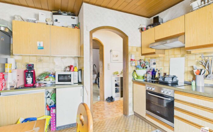 Das Obergeschoss ist seit 2013 vermietet. Die Wohnung mit ca. 55 m² Wohnfläche bietet ein Schlafzimmer, ein Wohnzimmer, eine Wohnküche mit Zugang auf den überdachten Balkon sowie ein kleines Tageslichtbad. Die monatliche Kaltmiete liegt aktuell bei 390 Euro.