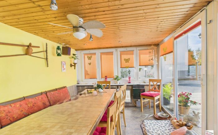 Im hinteren Bereich des Hauses liegt der große Hofbereich mit einem weiteren beheizten Wintergarten mit Strom- und Telefonanschluss sowie Zugänge zu zwei praktischen Außenkellerräumen und der großzügige Garten mit verschiedenen Nebengebäuden.
