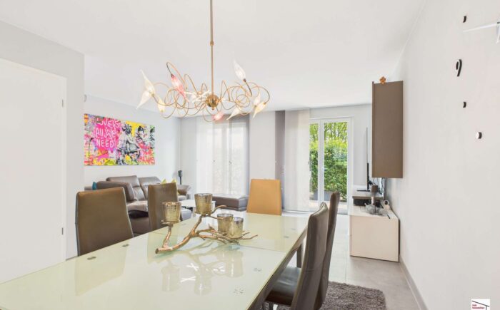 Im Erdgeschoss befindet sich der Eingangsbereich mit Tageslicht-Gäste-WC und Treppenaufgang zum Obergeschoss sowie der großzügige Wohn-/Essbereich mit angeschlossener offener Küche mit moderner Einbauküche und Zugang zur Terrasse und in den Garten. Ebenfalls führt ein direkter Zugang in das Untergeschoss.