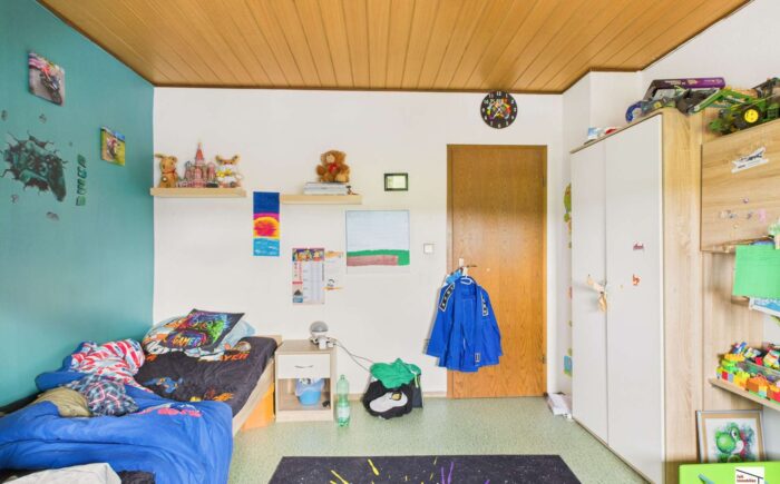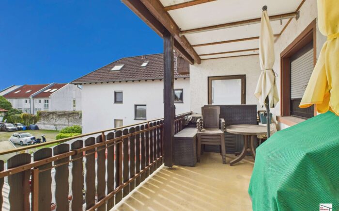 Das Obergeschoss ist seit 2013 vermietet. Die Wohnung mit ca. 55 m² Wohnfläche bietet ein Schlafzimmer, ein Wohnzimmer, eine Wohnküche mit Zugang auf den überdachten Balkon sowie ein kleines Tageslichtbad. Die monatliche Kaltmiete liegt aktuell bei 390 Euro.